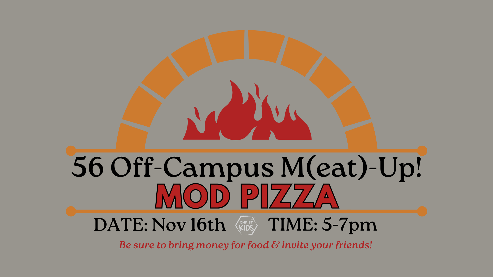 District 56, we’re heading off-campus to MOD Pizza! Get ready to slice into some games, fun and fellowship. Bring money for food and drinks, and don’t forget to invite your friends. We can’t wait to see you there!